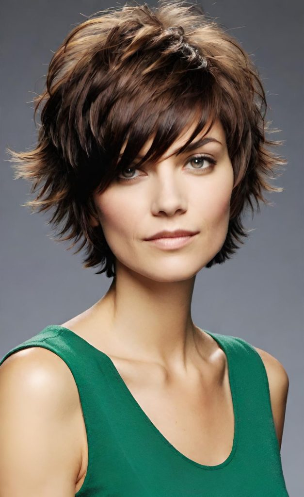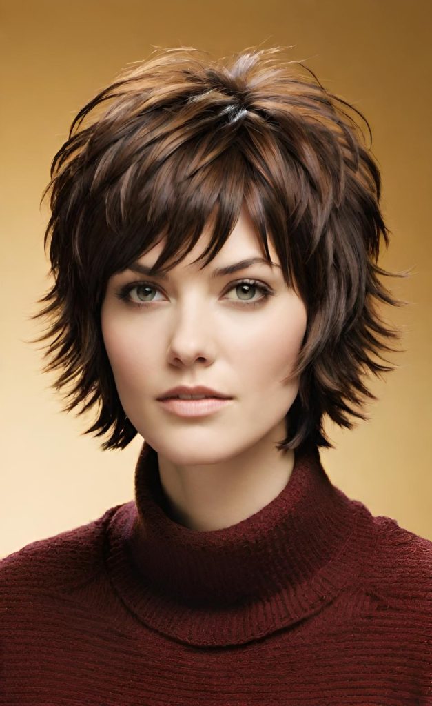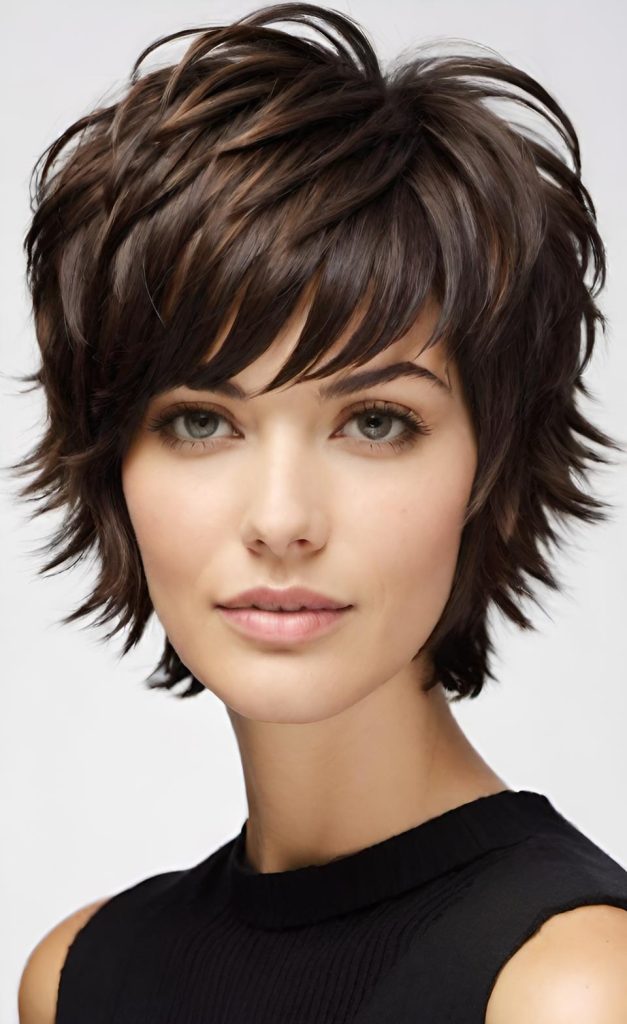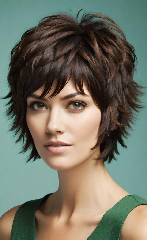 This short, layered, and shaggy brown hairstyle offers a wild and modern charm. Its dynamic texture and asymmetrical bangs create a unique style.