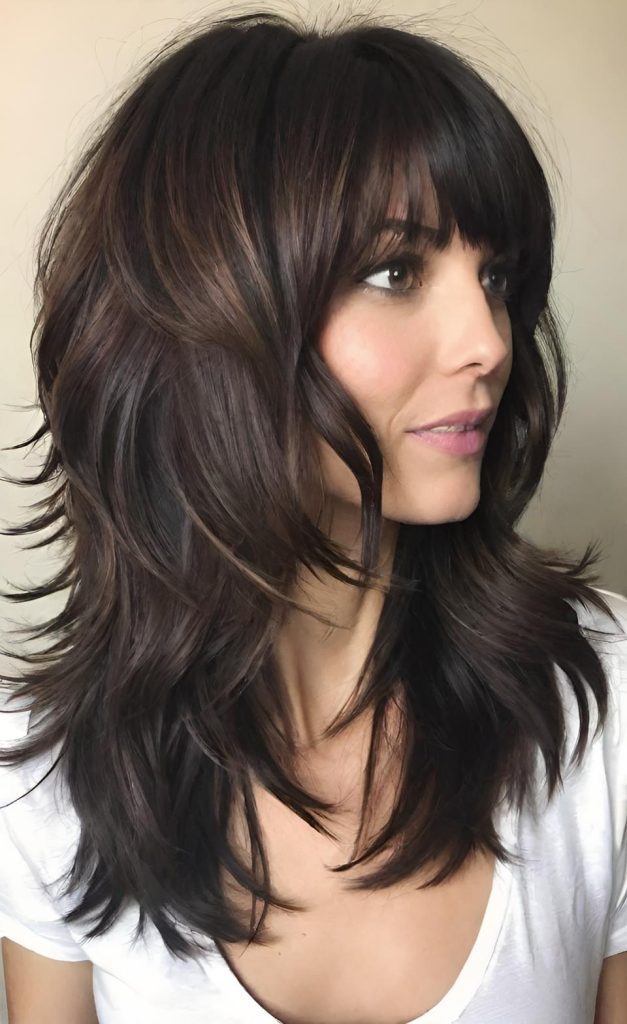 This captivating hairstyle combines the allure of deep, rich tones with the dynamic appeal of a layered cut. The thick, full bangs beautifully frame the eyes, adding a mysterious and enchanting touch to the face. Shoulder-length layers create natural movement and voluminous body. Subtle highlights, particularly in rich coffee tones, enhance the hair’s depth, creating a modern and elegant overall look. This style is perfect for strong, confident women, offering an effortless way to achieve both daytime chic and nighttime sophistication. π