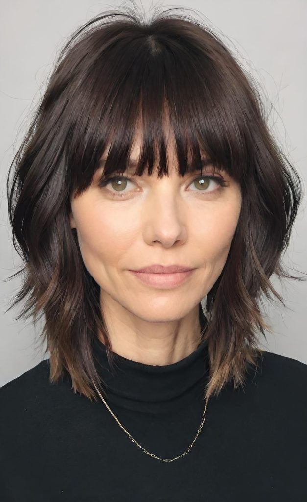 The soft bangs are the quiet star of this style. They don’t overpower the face or demand constant styling. Instead, they fall naturally, framing the features with an easy softness that adds warmth and approachability. Whether slightly parted or worn loose, they blend seamlessly into the rest of the cut.