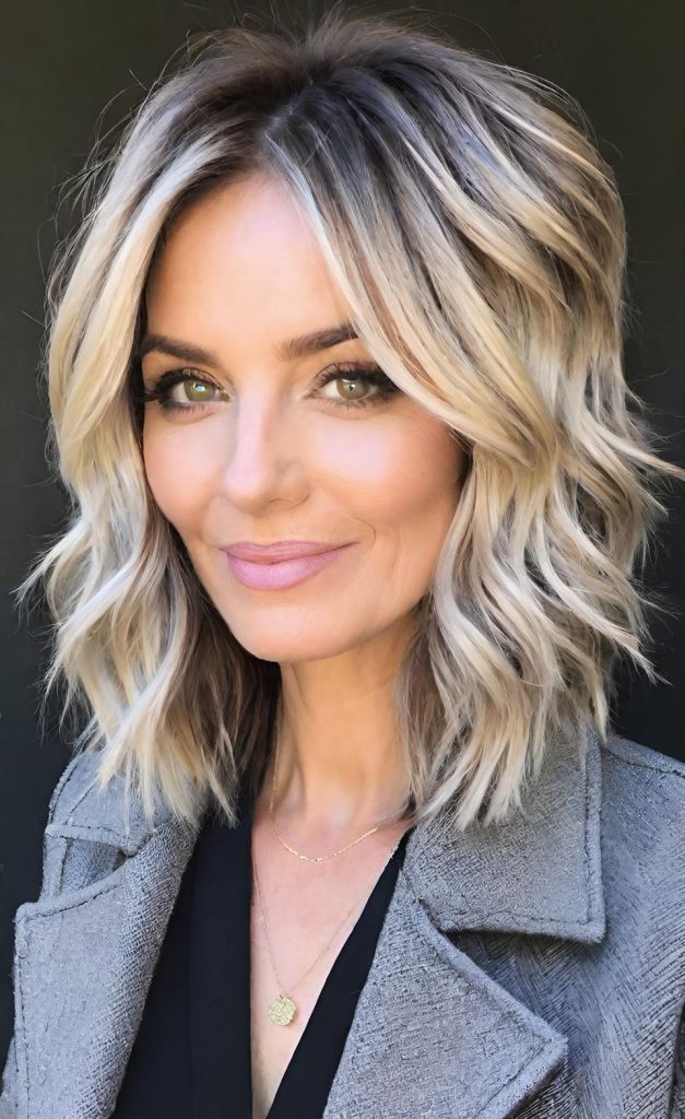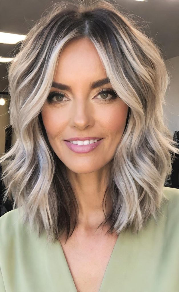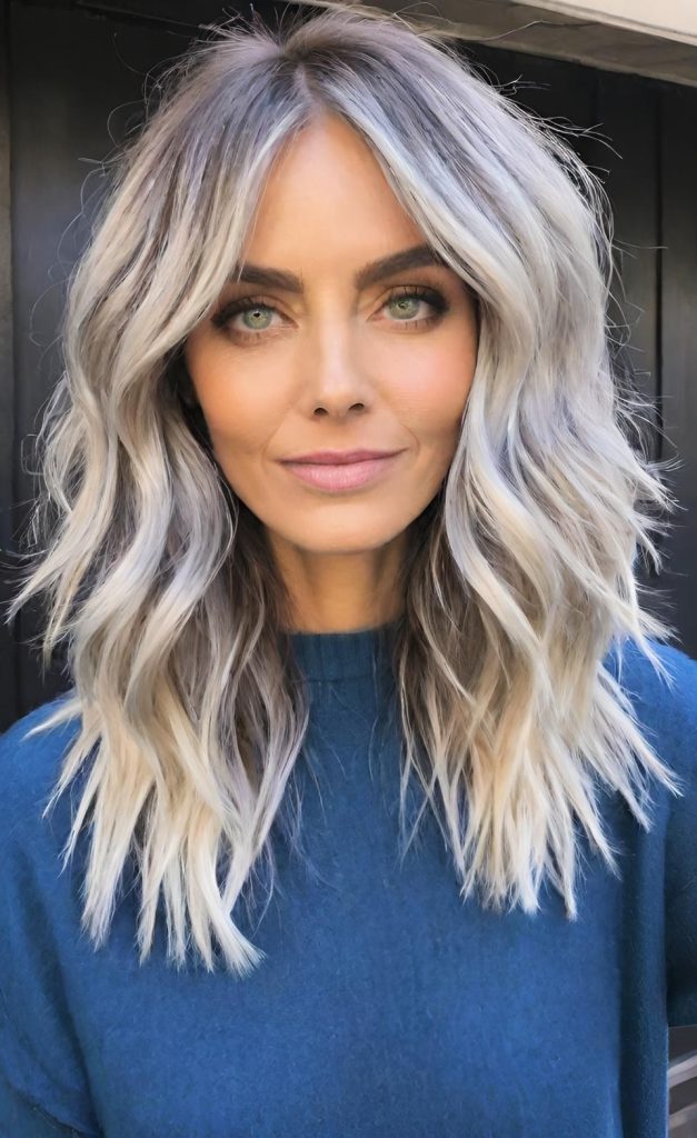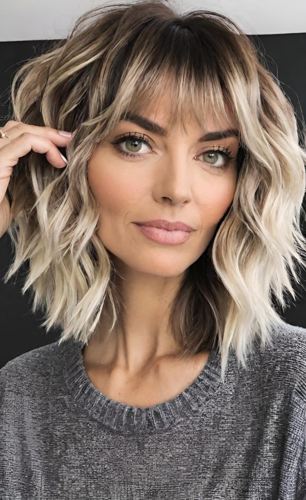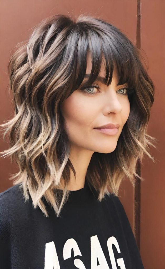 This hairstyle is the perfect way to look both edgy and incredibly elegant! The shoulder-length layered cut adds amazing volume and movement, while the wispy bangs skimming the lashes add depth to the gaze. Especially when combined with icy blonde balayage, this textured structure perfectly captures that “I woke up like this, but better” vibe. It’s a modern, dynamic, and absolutely captivating choice for anyone looking to refresh their look!