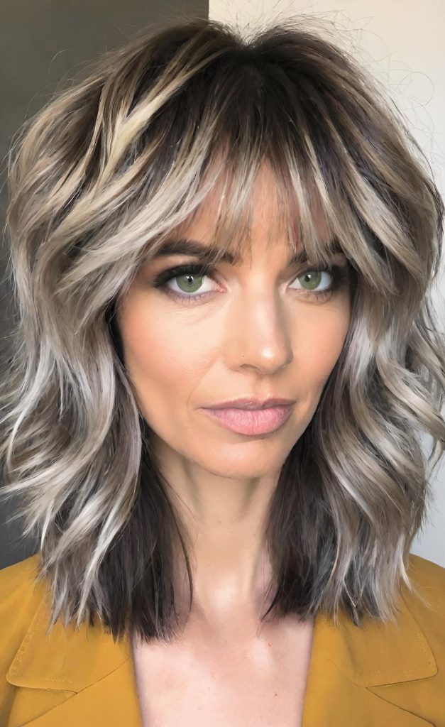Starting with this hairstyle, we are looking at a masterpiece where volume truly peaks! The dense layers at the crown provide incredible fullness, while the ashy blonde tones contrasting with dark roots frame and brighten the face beautifully. The fringe falling just above the eyes adds a mysterious touch to this messy yet controlled look. For those who want to look both edgy and sophisticated, this model is a total inspiration for a fresh seasonal update!