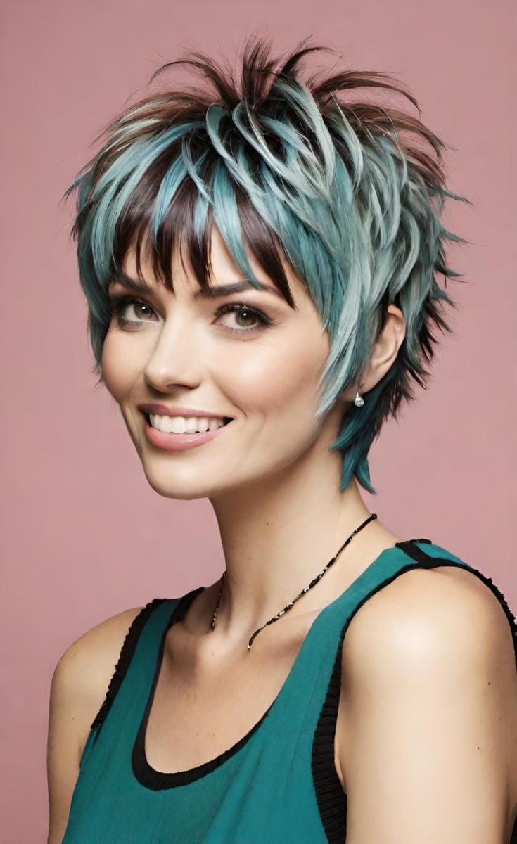 The layered shaggy pixie with side bangs creates a fun, sassy style that’s perfect for those who want a short, easy-to-maintain haircut with a little extra flair. The side bangs provide a soft frame for the face, complementing the layers of the pixie cut.