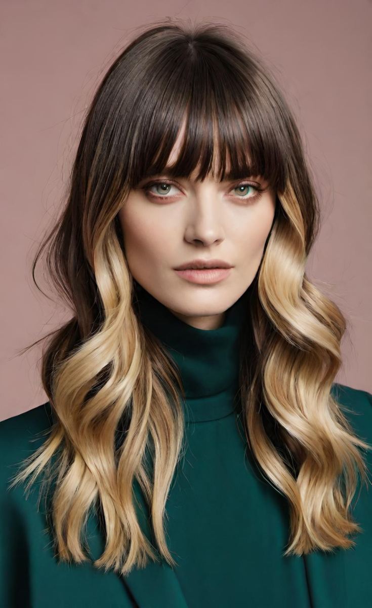Timeless and elegant, classic curtain bangs part naturally down the middle, framing the face symmetrically.