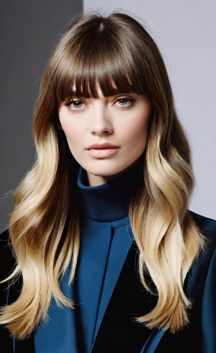 Timeless and elegant, classic curtain bangs part naturally down the middle, framing the face symmetrically.