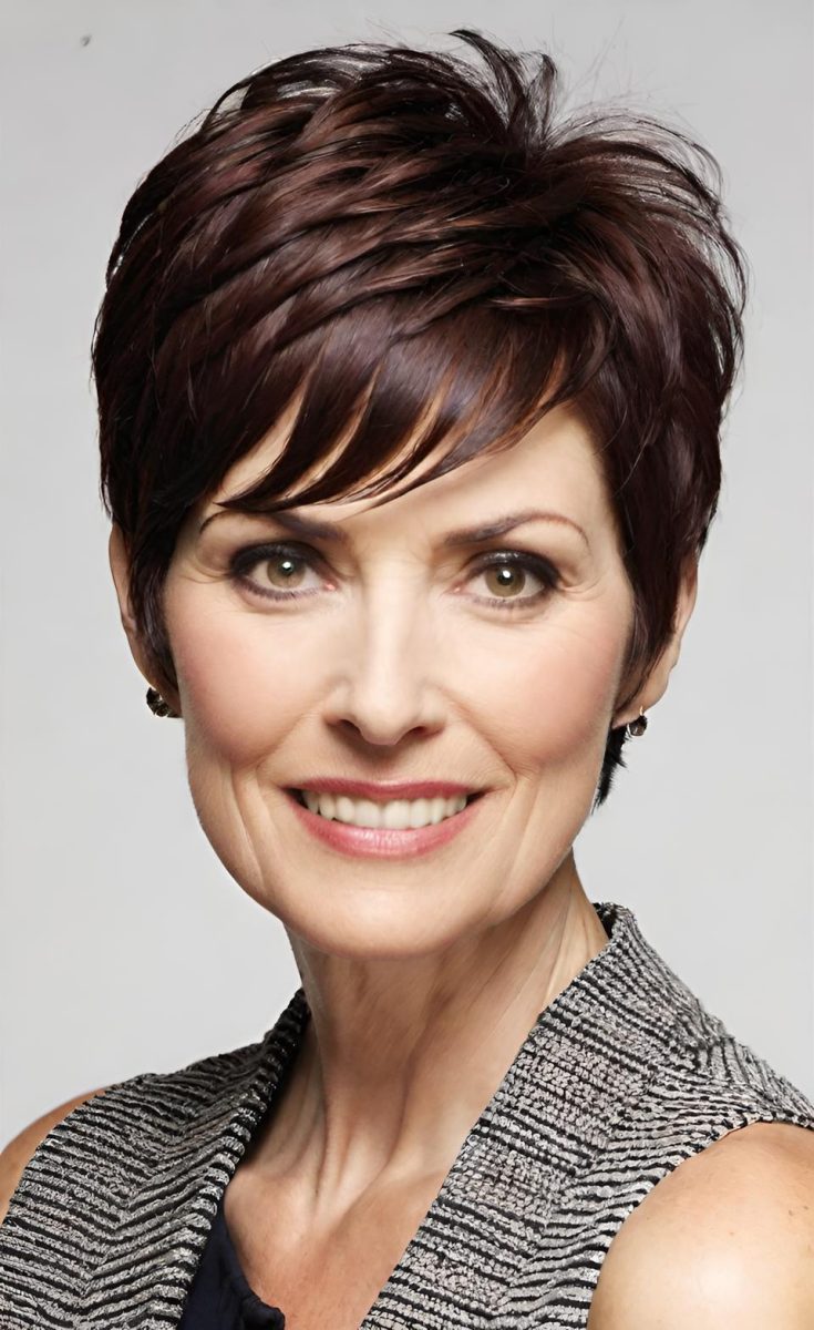 A feathered pixie cut with extra volume on top elongates the face and adds a youthful lift. This cut is ideal for those who want a soft yet stylish look.