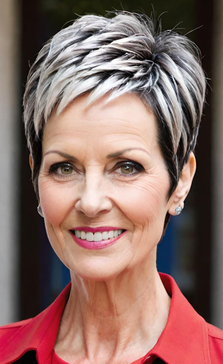 A feathered pixie cut with extra volume on top elongates the face and adds a youthful lift. This cut is ideal for those who want a soft yet stylish look.