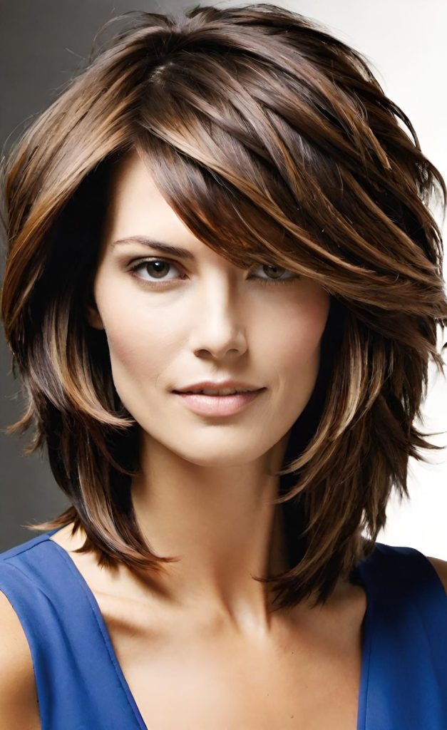 A deep side part enhances volume and adds a glamorous touch to layered shoulder-length hair.