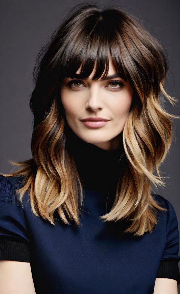 Pairing a shoulder-length cut with curtain bangs creates a chic, face-framing effect that softens the overall look.