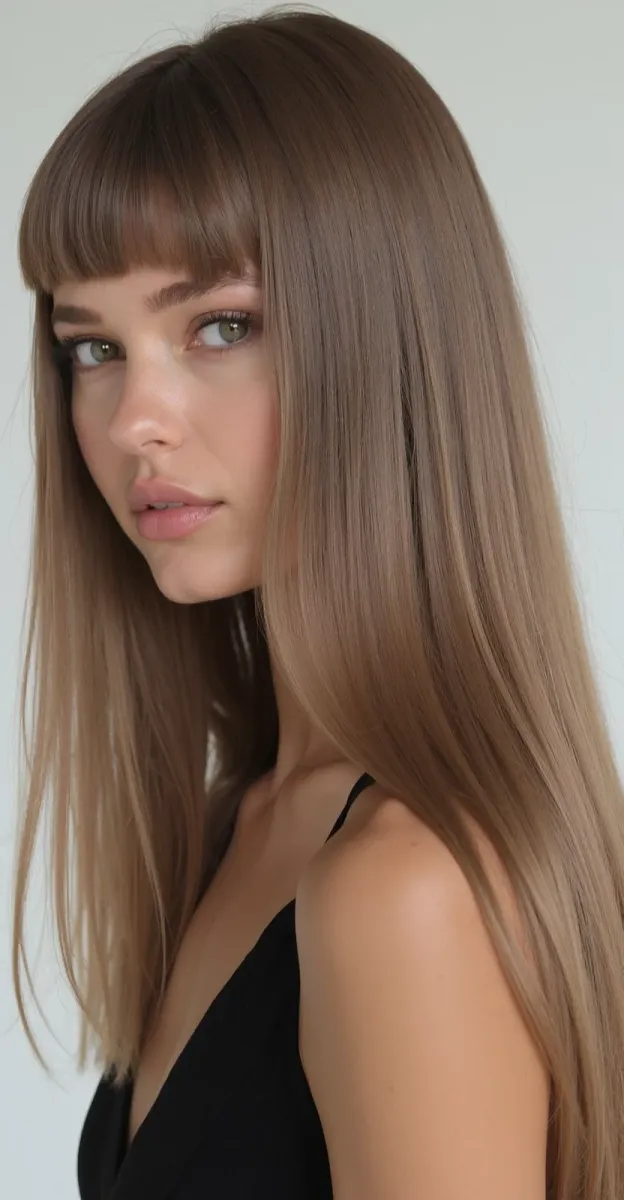 Side-swept bangs work beautifully with straight hair, softening the face and providing an elegant, timeless look. The bangs blend seamlessly into the straight strands, adding volume to the top while framing the face in a flattering way.