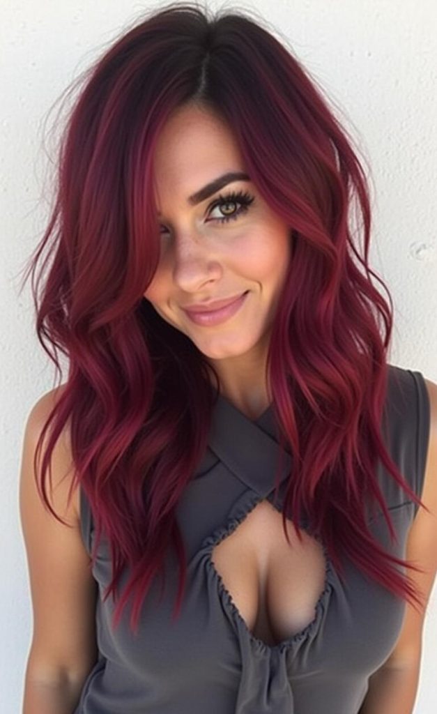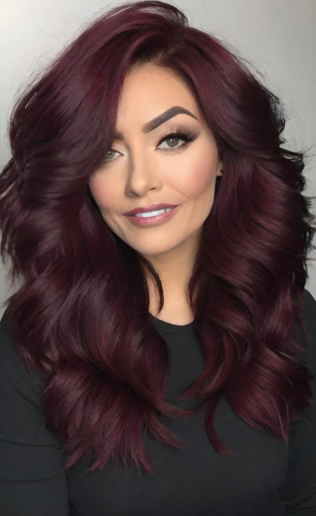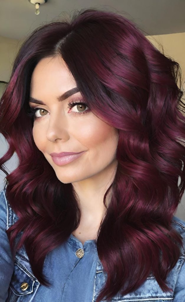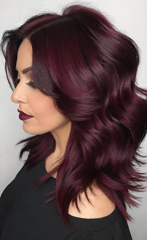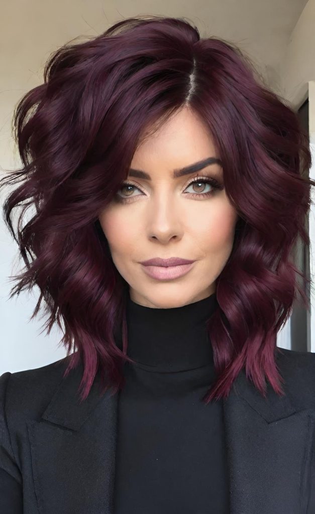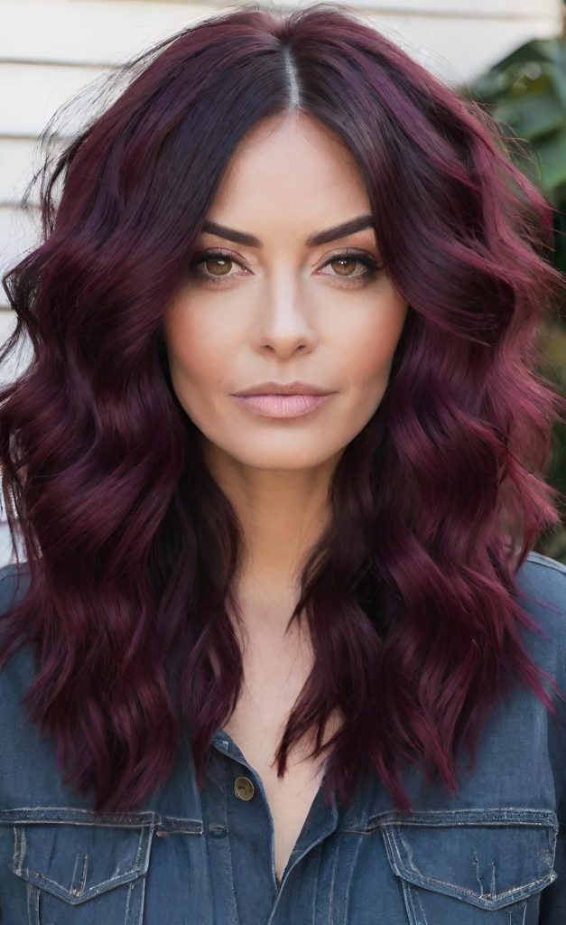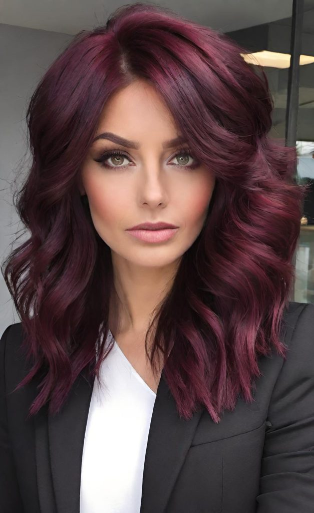This hairstyle combines the allure of burgundy with prominent waves and a voluminous cut. The way the hair gently frames the face and the vibrancy of the deep burgundy tone create both a chic and dynamic vibe. A bold and romantic choice that will make everyone turn for a second look!