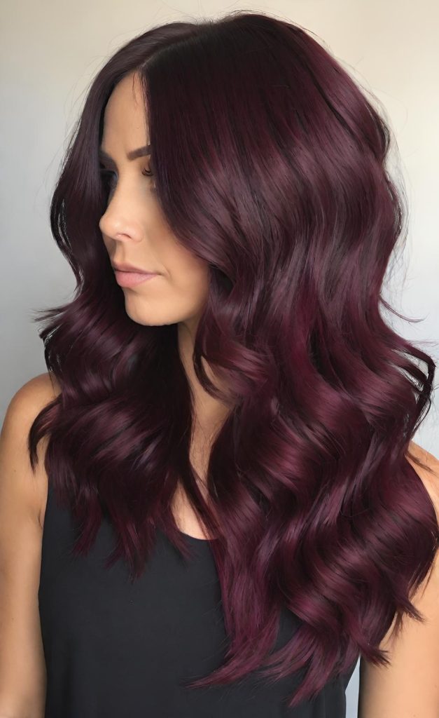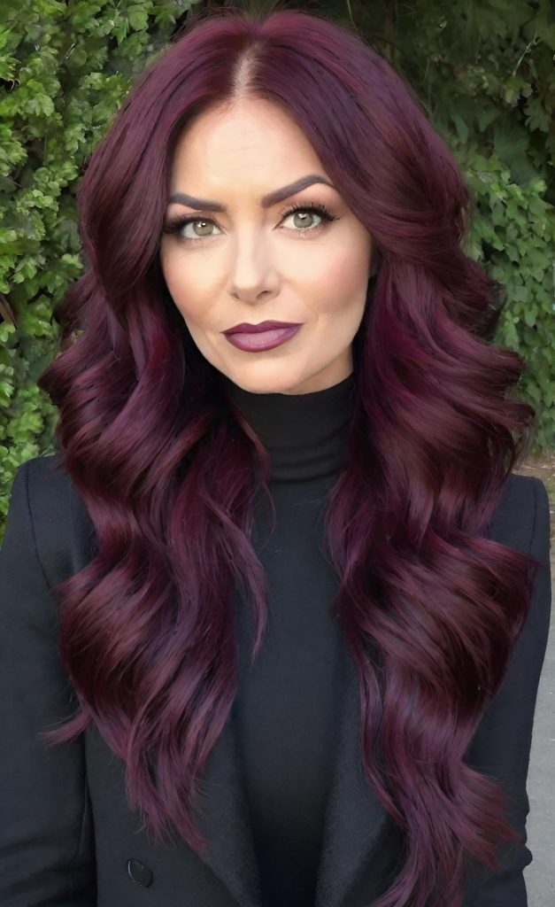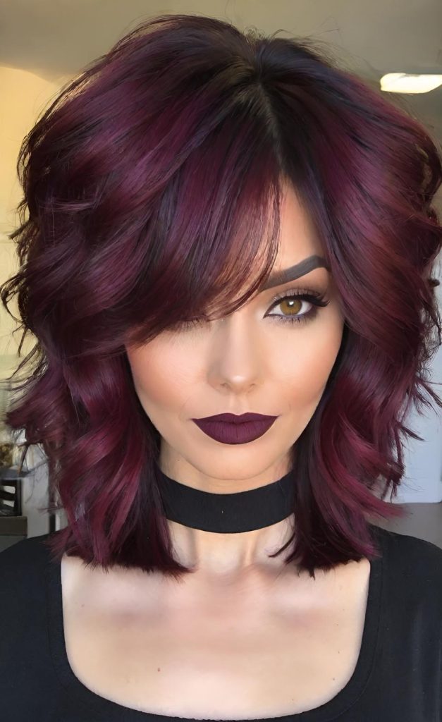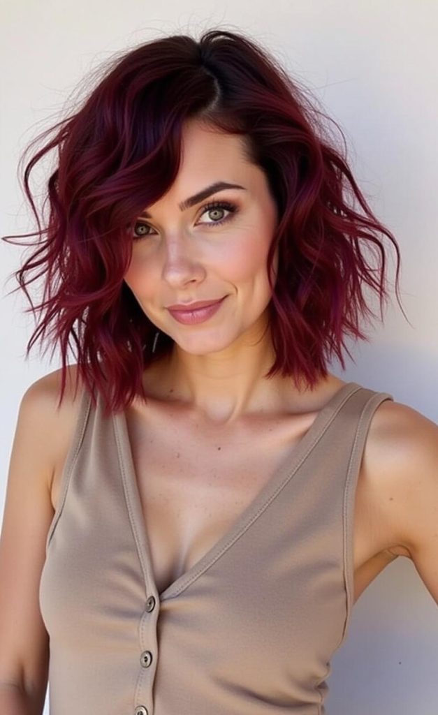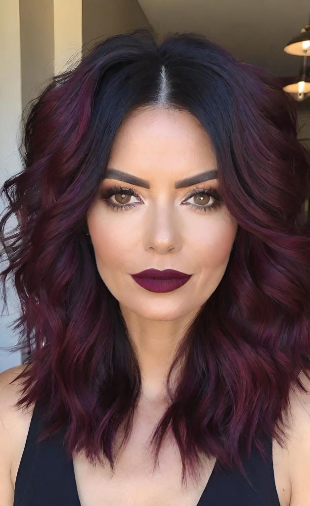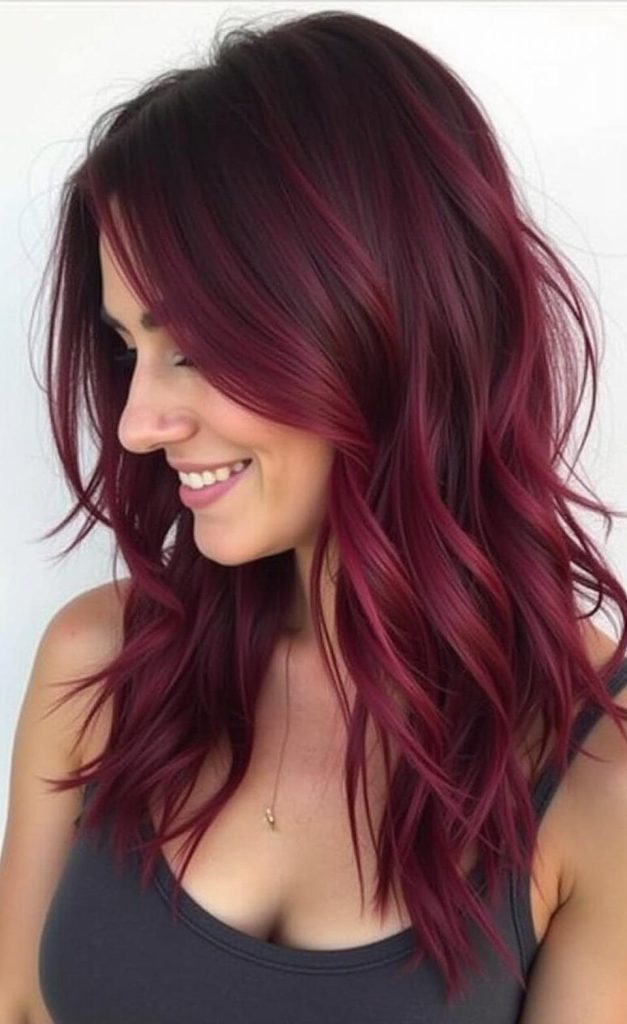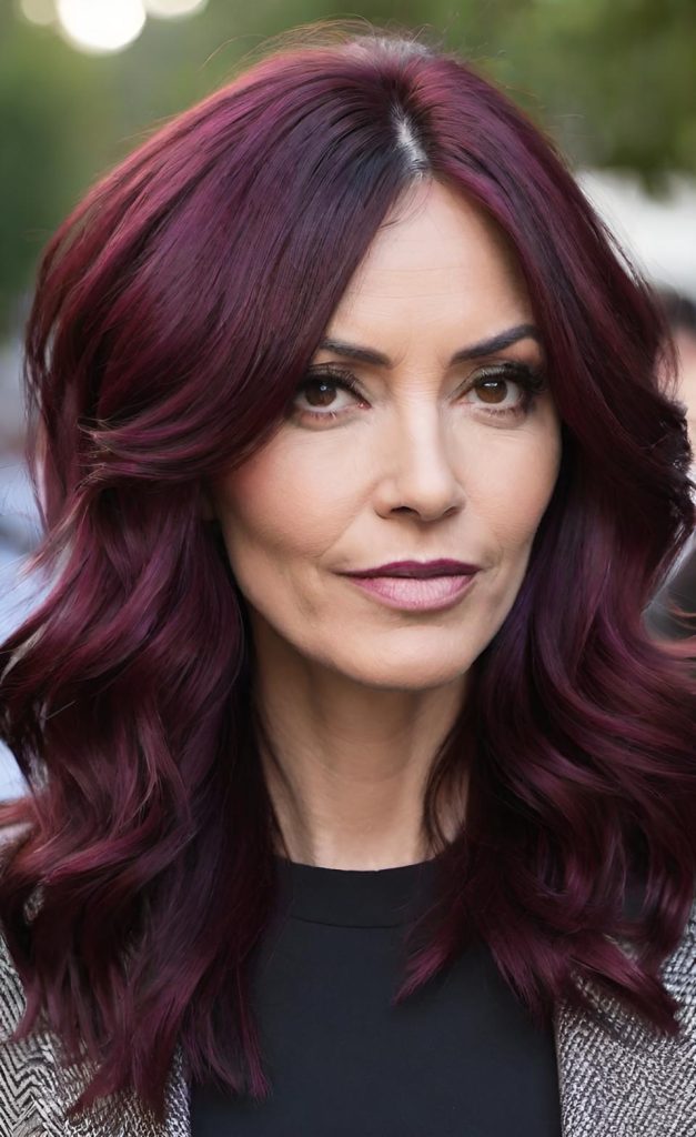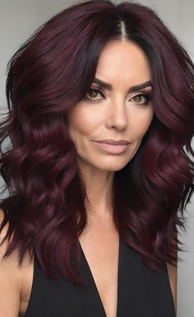 This hairstyle combines the allure of burgundy with prominent waves and a voluminous cut. The way the hair gently frames the face and the vibrancy of the deep burgundy tone create both a chic and dynamic vibe. A bold and romantic choice that will make everyone turn for a second look!
