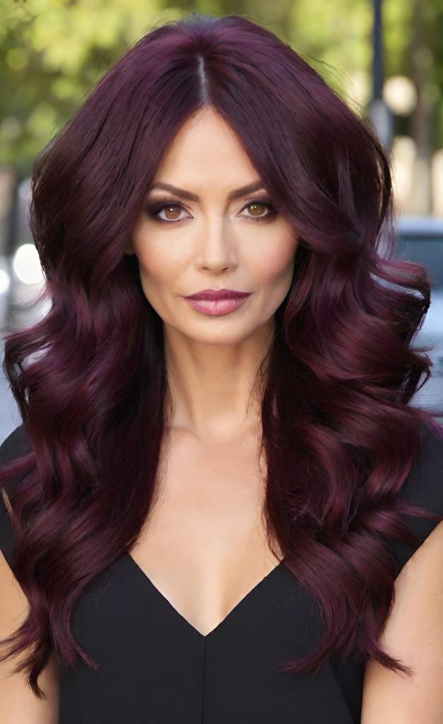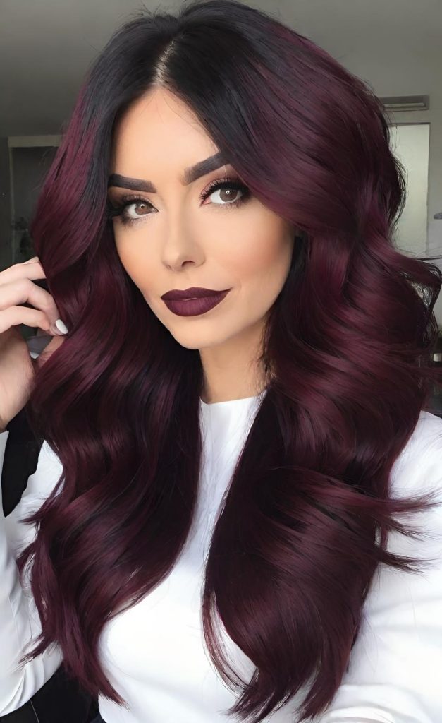 This style presents a sophisticated burgundy look that works even with formal attire. The hair’s thick, voluminous waves and the dark root transition add an air of nobility and depth. A perfect fit for the Chic theme, ideal for a powerful and attractive statement!