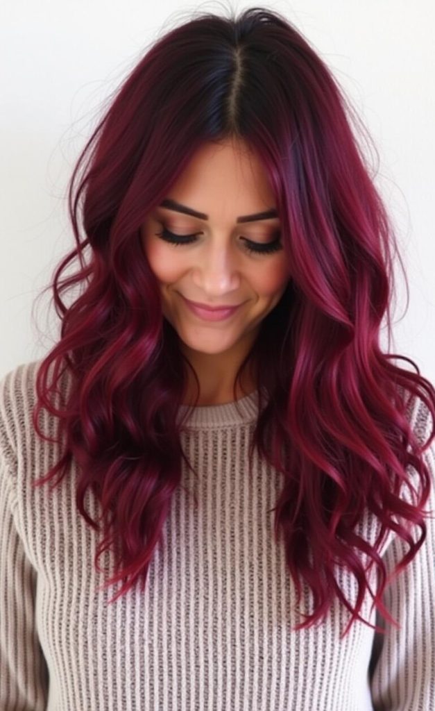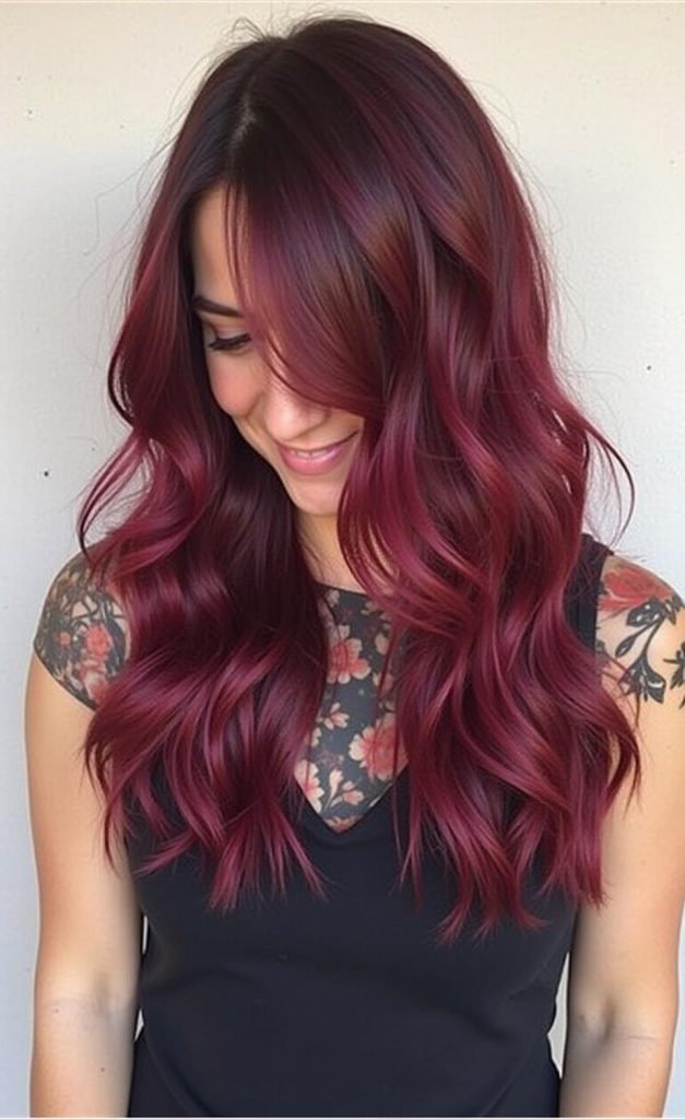6-Luxurious Waves: Deep Burgundy on Dark Roots! πŸ–€πŸ‡