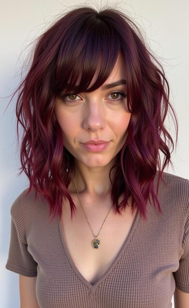 19-Burgundy Shag with Bangs: Rebellious and Alluring! πŸ’₯🍷