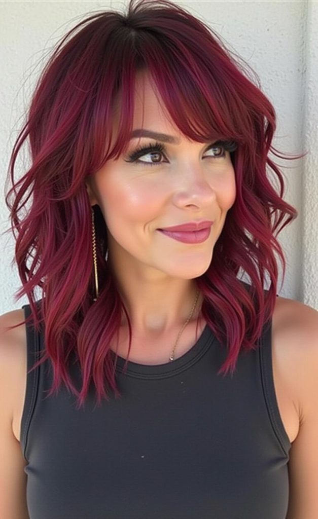This style merges a vibrant burgundy color with tousled waves and bangs. The light layers add tremendous volume and movement to the hair, while the bangs accentuate the eyes. A youthful and playful look that radiates bold energy!
