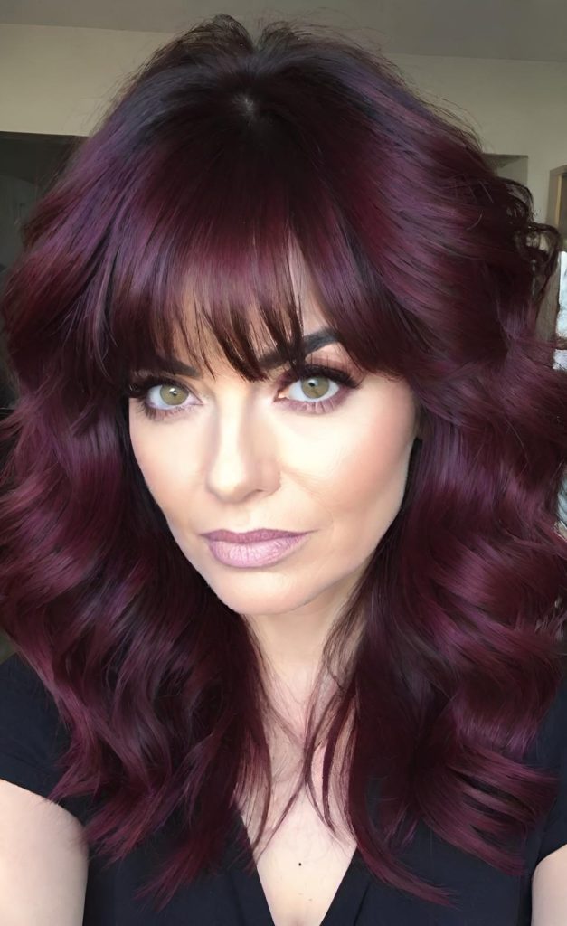 These full bangs dramatically emphasize the eyes, while the intensity of the burgundy color and voluminous waves add a feminine touch. The dark roots give the color depth and dimension. An eye-catching choice for those seeking Bold Energy and allure!