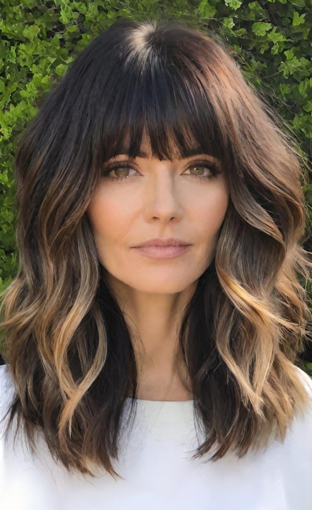 The hairstyle in this picture gives off a cheerful and modern vibe. The medium-length layered cut gently frames the face, adding natural movement and fullness to the hair. The fringe, which starts at eye level and becomes thicker, makes the gaze more prominent. The broad, light-colored balayage highlights at the ends create a striking contrast with the dark roots, giving the hair a vibrant, sun-kissed appearance. This style is perfect for women seeking a natural and relaxed look with a modern touch.