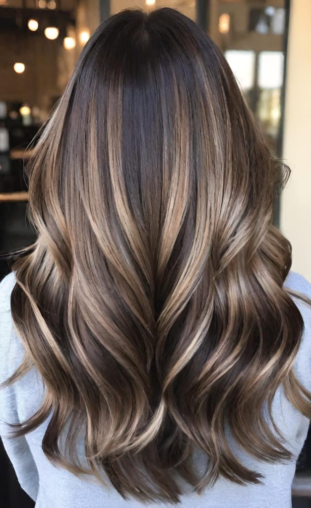 There is an incredible balance in this style between the dark brown base and the medium ash beige highlights. ⚖️ The subtle illuminations sprinkled, especially on the front sections, gently frame the face. This color, combined with voluminous and shiny waves, creates a rich and multi-dimensional effect. A natural yet sophisticated choice that perfectly suits the “Soft Contrast” theme! 💖