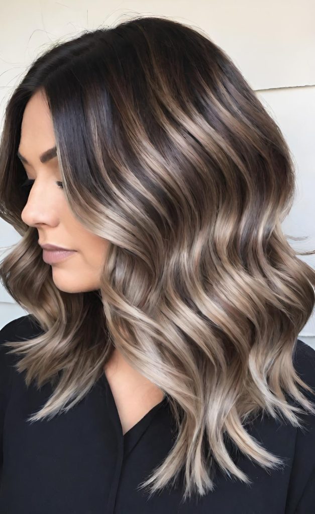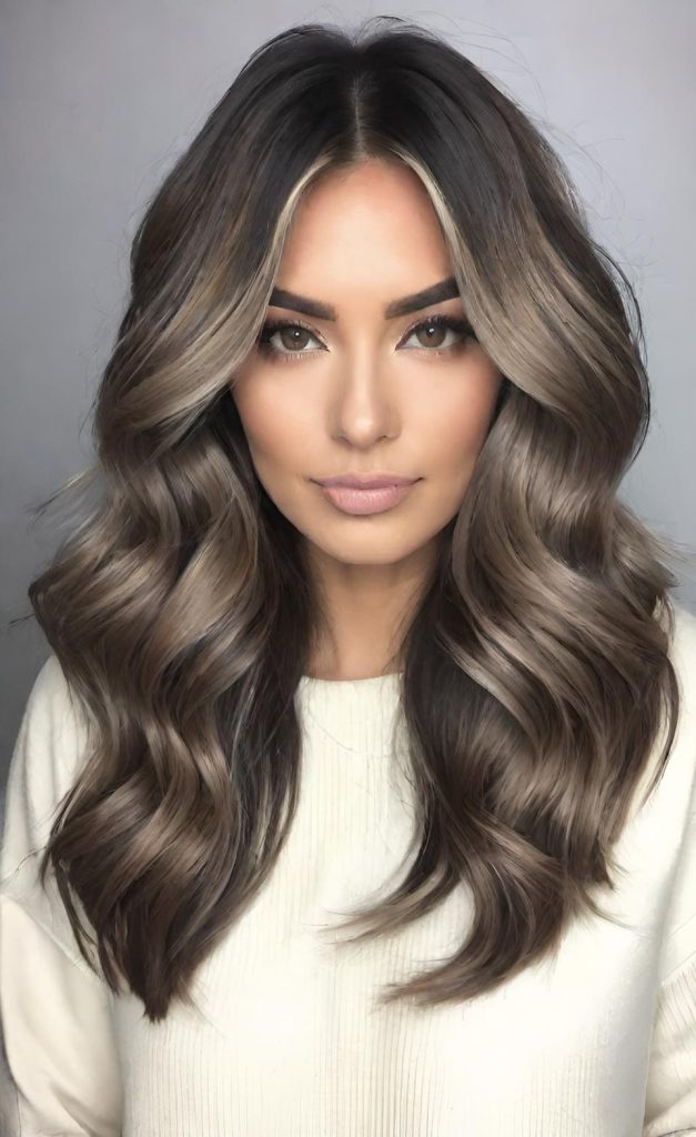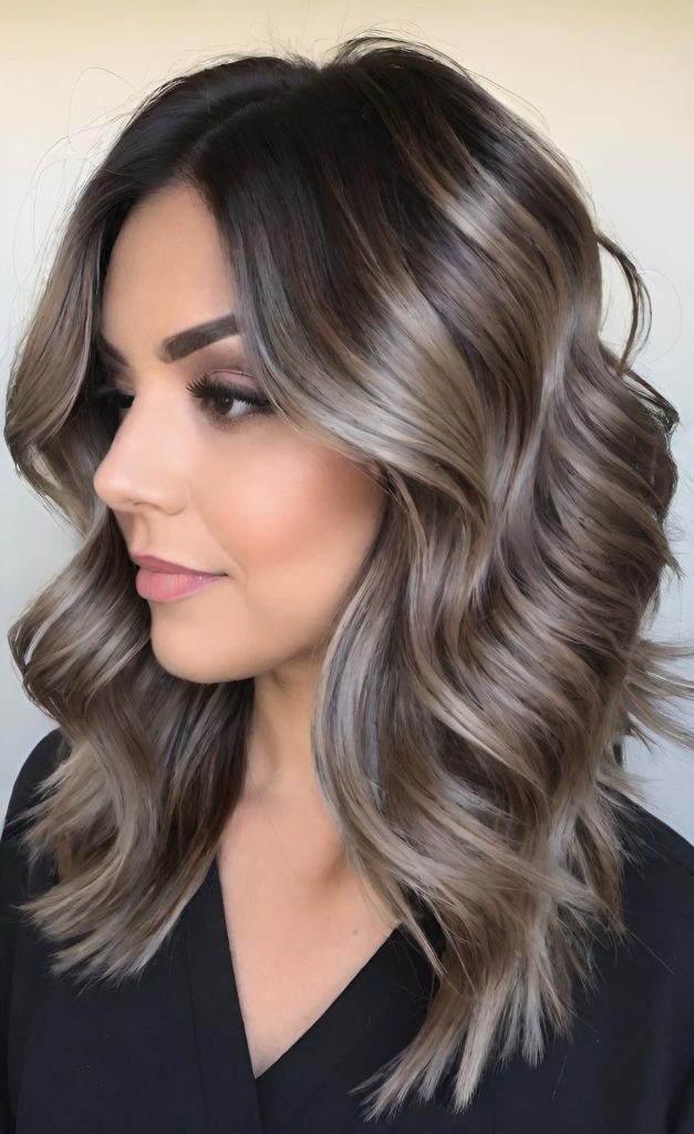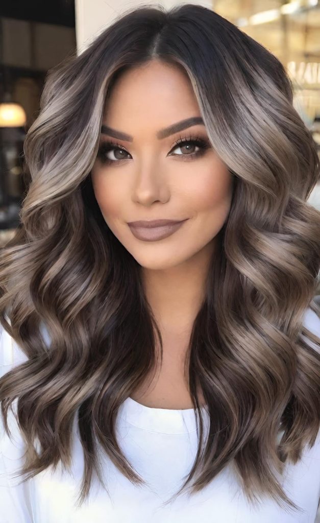 This hairstyle showcases the most fluid and natural transition of ash brown. 🌊 The subtle balayage, starting from deep roots, perfectly complements the hair’s natural movement. Each wave reveals different tones of the color, creating a rich and multi-dimensional look. This style is ideal for those who love luminosity but don’t want to compromise on a natural appearance. Truly sophisticated and captivating! 💖