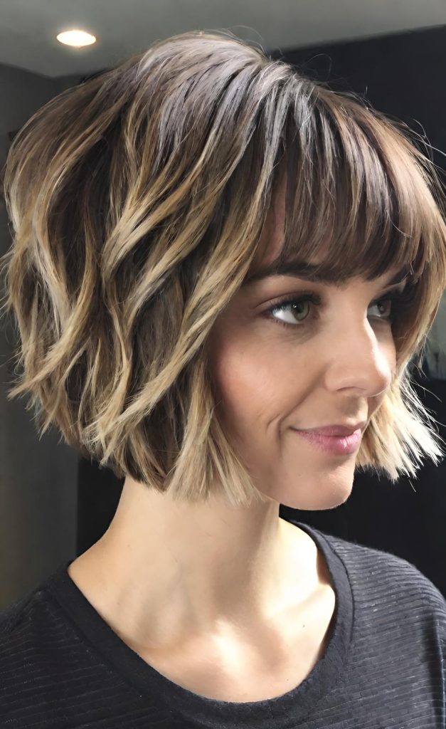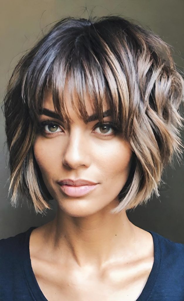 This image perfectly captures the appeal of a “textured choppy bob.” The subtle waves and layered cut create a look that is both effortless and chic. The highlights add dimension, making the hair appear more voluminous and full of life. The soft bangs frame the face beautifully, while the choppy ends give the style a modern, edgy feel. It’s a versatile look that’s easy to maintain and can be styled for any occasion. This haircut is perfect for those who want a fresh, low-maintenance style that still makes a statement.