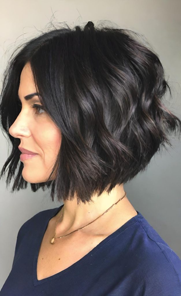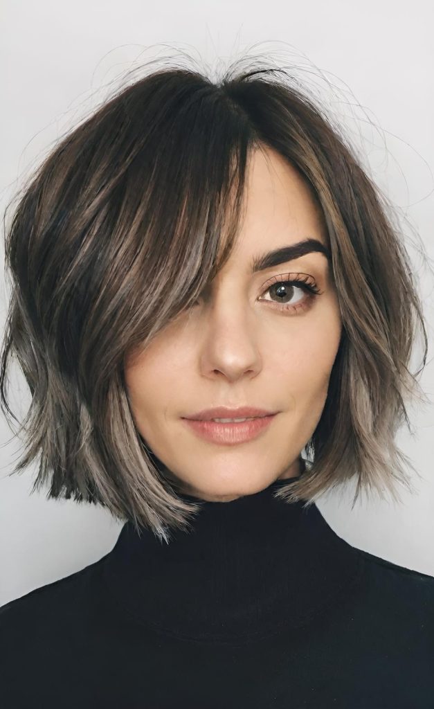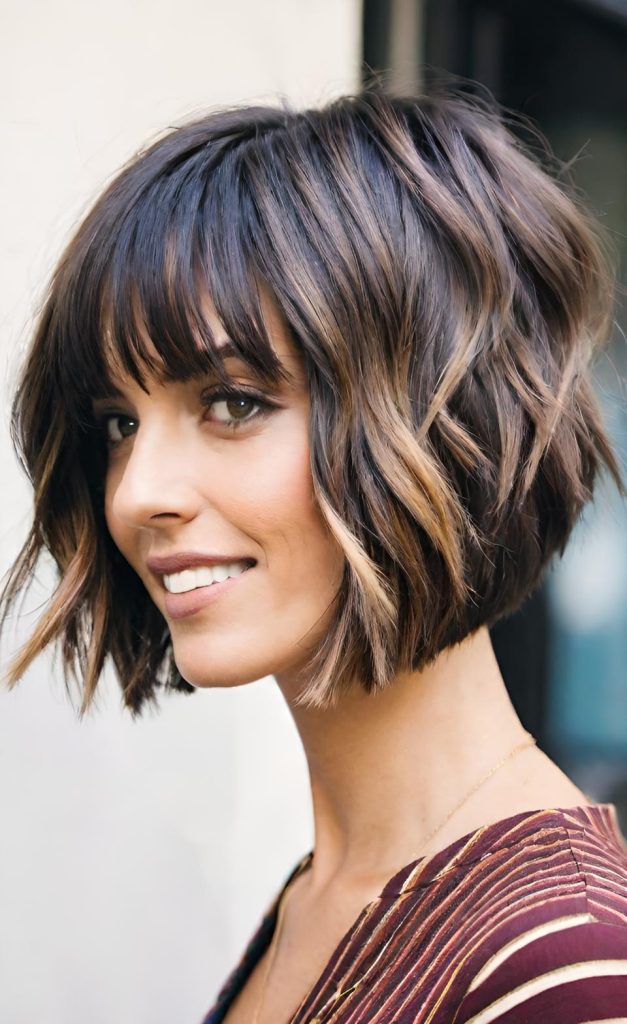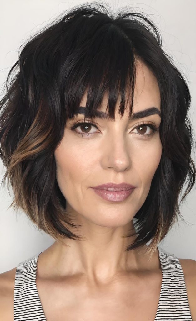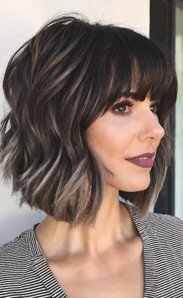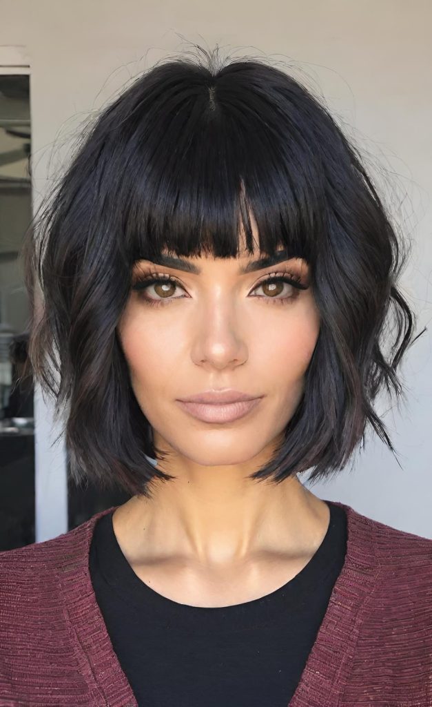 This haircut is a stunning combination of classic charm and modern edge. The full, slightly wispy bangs beautifully frame the eyes, adding a sense of mystery and drama. The deep, dark hair color enhances the style’s timeless elegance, while the textured, wavy layers give the bob a fresh and voluminous feel. This is the perfect haircut for the woman who wants to make a confident statement. It’s a versatile and chic choice that is both romantic and incredibly fashionable. 🌟