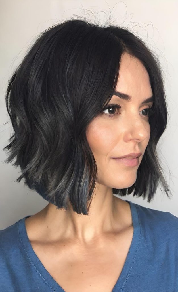 This hairstyle is a perfect blend of classic elegance and modern edge. The deep, rich black bob is given a captivating twist with subtle, gray highlights on the ends. 🎨 The textured, wavy layers create beautiful movement and volume, making the hair look full and healthy. This look is ideal for the woman who wants to add a unique, sophisticated detail to her classic style. It’s a chic, versatile, and confident choice that shows you’re not afraid to play with color and texture. 🌟