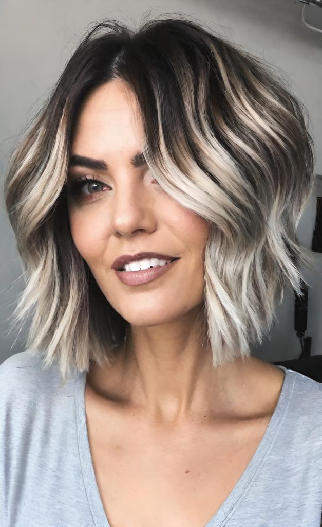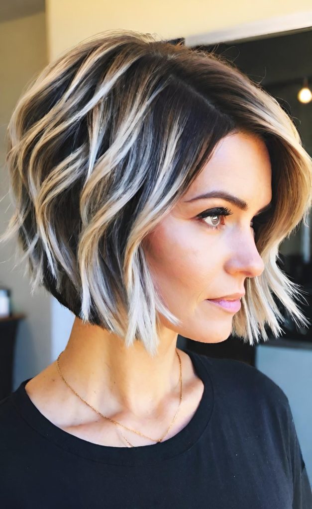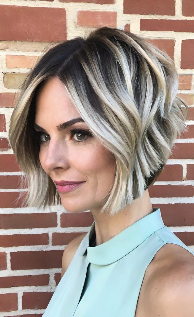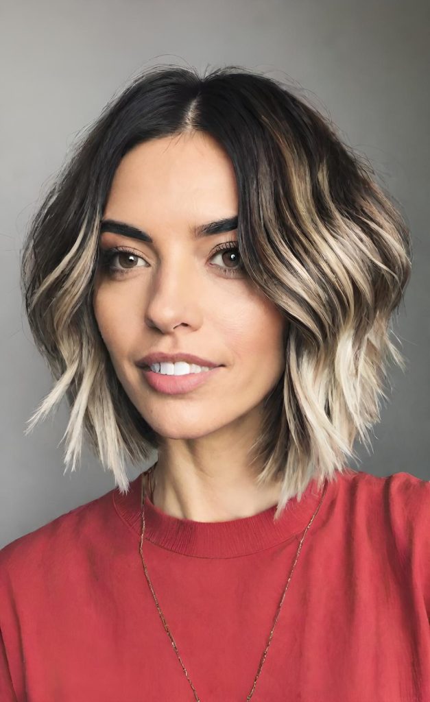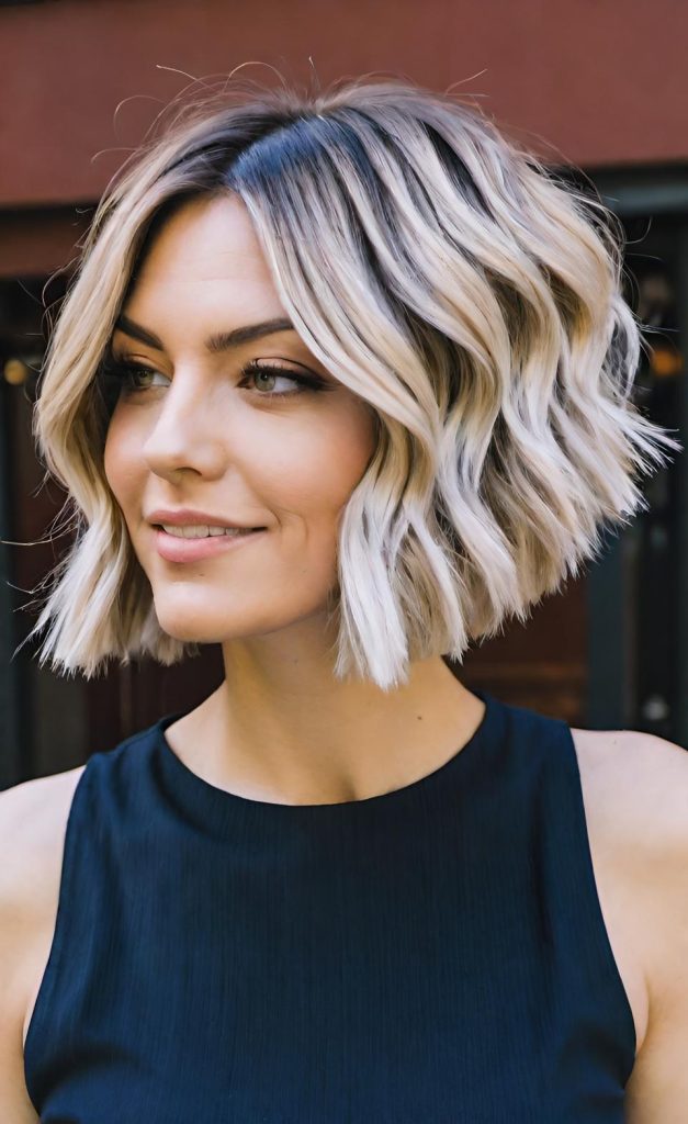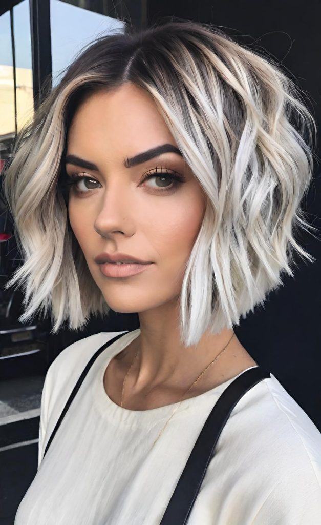 This is a showstopper! The bold contrast between the dark roots and the bright, icy platinum blonde highlights creates an edgy and incredibly chic look. The textured, wavy layers give the bob a beautiful sense of movement and volume, making the hair look full and vibrant. This is the perfect haircut for the confident woman who wants to make a strong fashion statement. It’s a versatile and daring style that is guaranteed to turn heads and leave a lasting impression. 🤩