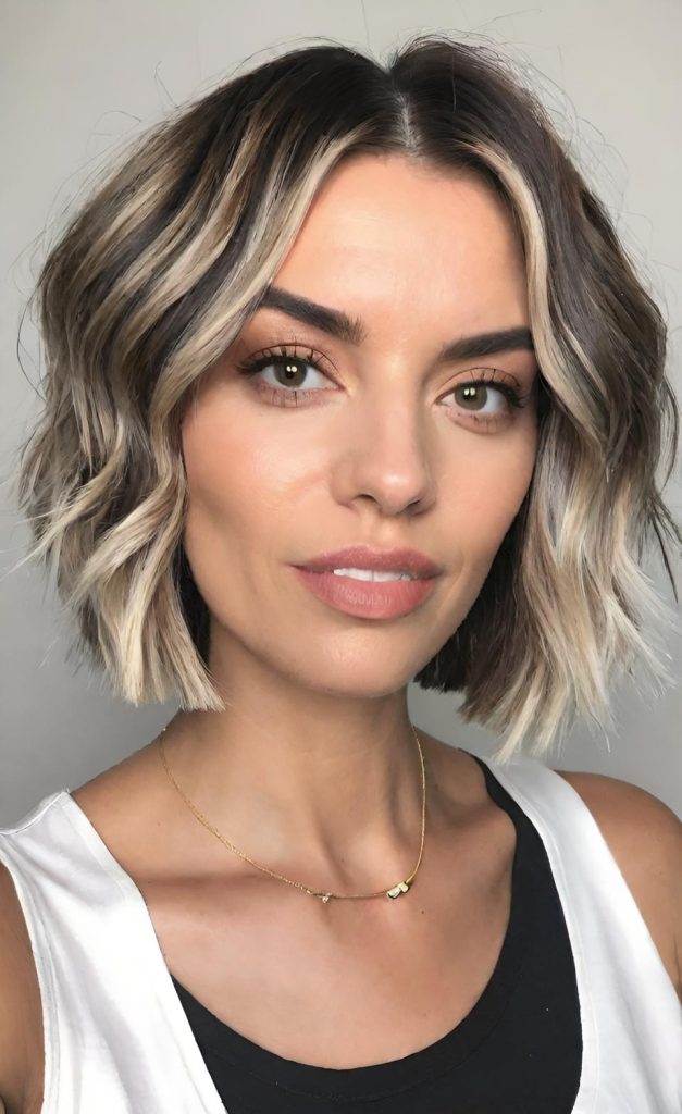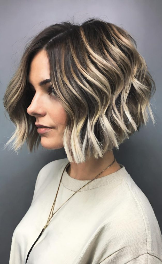 This is a stunning example of a modern, textured bob. The beautiful contrast between the darker roots and the bright, shimmering highlights creates incredible dimension and a sense of effortless style. The defined, loose waves add volume and movement, making the hair look full of life and bounce. This haircut is perfect for anyone who wants a fresh and versatile look that is both stylish and easy to maintain. It’s a true statement piece that radiates confidence and charm. 🤩