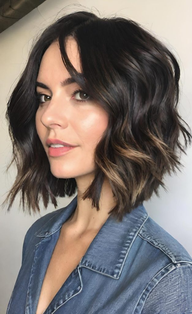 This bob haircut is a beautiful combination of rich, dark tones and bright, sun-kissed highlights. The strategically placed lighter strands add incredible dimension and movement, making the hair look full and vibrant. 💫 The messy, textured waves give it a cool, effortless vibe that is both chic and versatile. This style is an excellent choice for anyone who wants to brighten up their look without a full color change. It’s a low-maintenance cut that always looks fresh and fashionable. 🌟