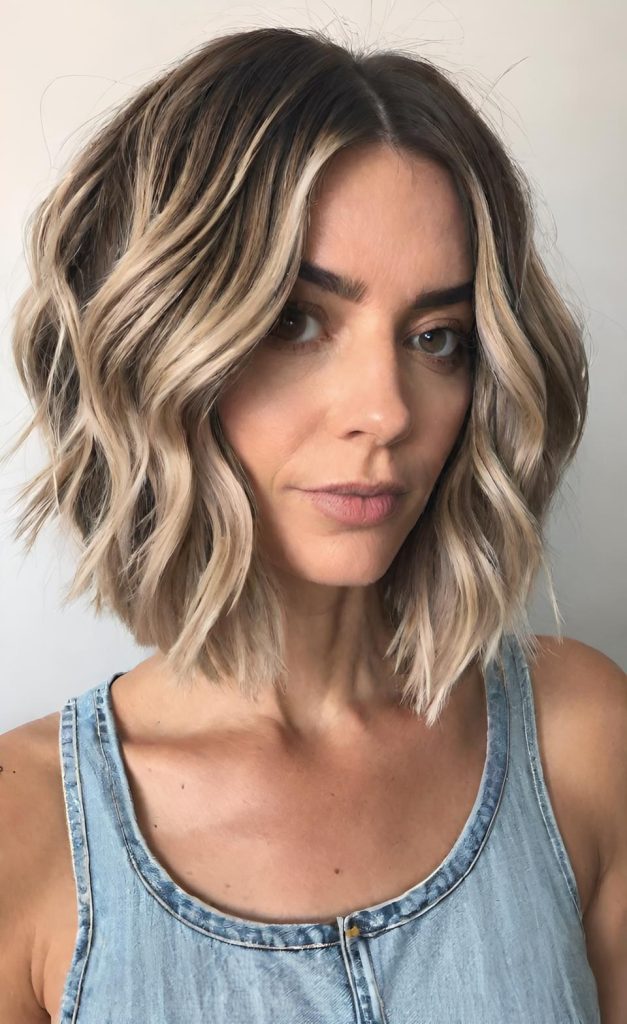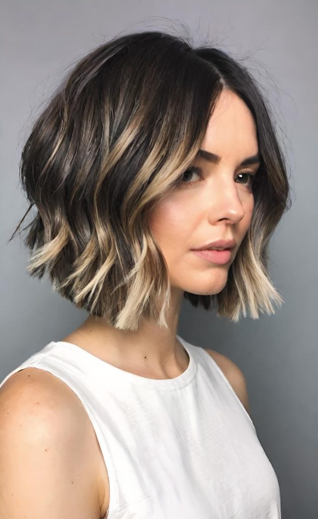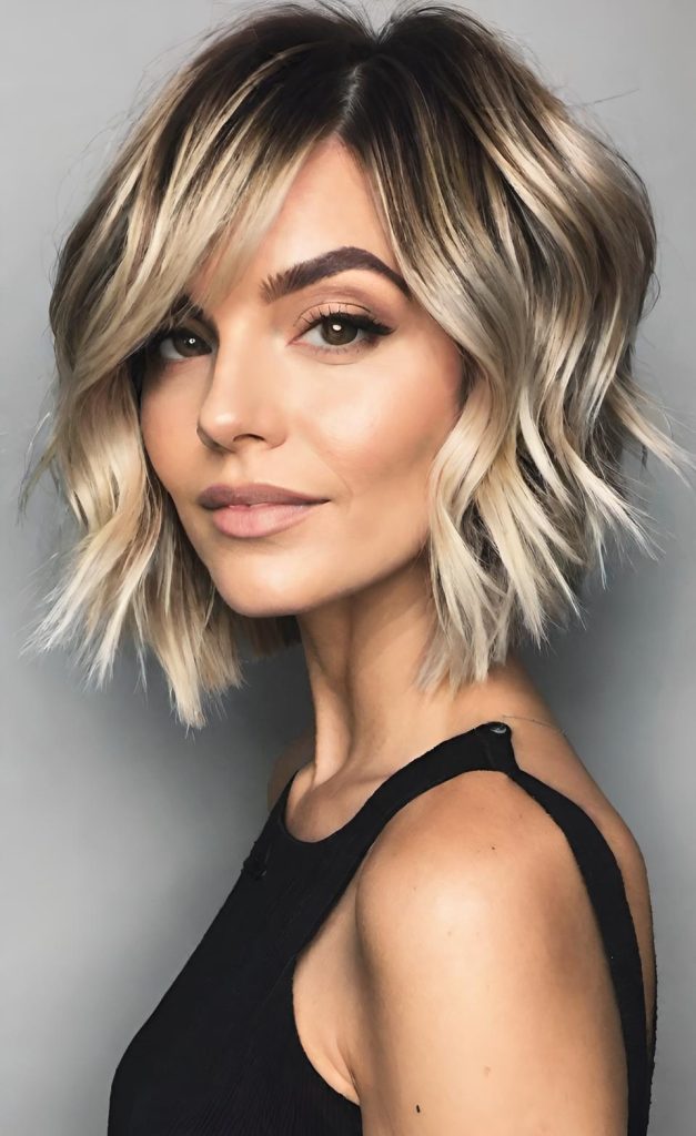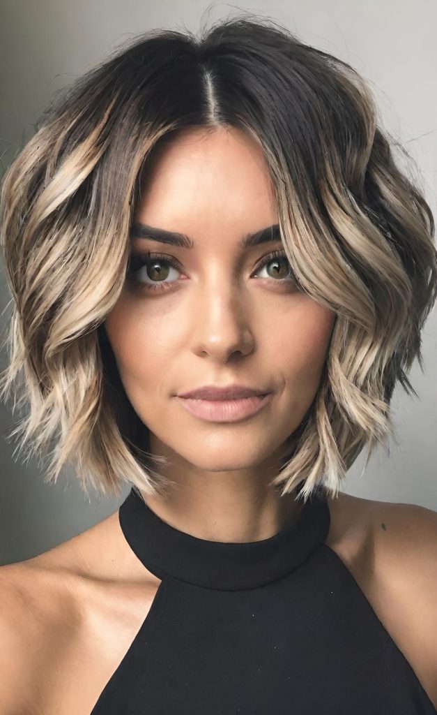 This image showcases a stunning “sun-kissed” textured bob. The dark roots transition smoothly into beautiful, bright blonde highlights, creating a high-contrast and very fashionable look. The wavy texture gives the hair a playful, yet elegant feel, and the length perfectly frames the face. This style is an excellent example of how a well-executed color blend can elevate a simple cut. It’s a bold and glamorous choice for anyone looking to make a statement with their hair. The vibrant color and dynamic texture make it a showstopper for any occasion.