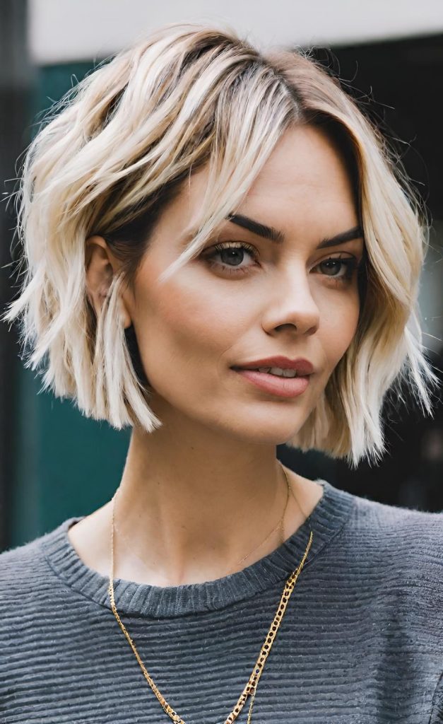 This haircut is the epitome of cool-girl style! The vibrant, icy blonde tones blend beautifully from a darker root, creating a stunning contrast and incredible dimension. The choppy layers and wavy texture give the bob a fun, effortless feel, making it look incredibly voluminous and full of life. This is the perfect cut for the woman who wants to make a bold statement with her hair. It’s a versatile and fashionable choice that is guaranteed to turn heads and leave a lasting impression. ✨