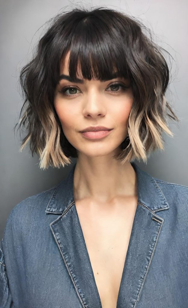 This hairstyle perfectly combines a playful fringe with a sophisticated, textured bob. The soft, wispy bangs beautifully frame the face, while the wavy layers create a sense of effortless movement and volume. The subtle highlights at the ends add a touch of luminosity and modern flair. This look is perfect for anyone who wants a youthful, fresh, and stylish haircut. It’s a versatile style that looks great on any occasion and gives off an air of confidence and charm. 🤩