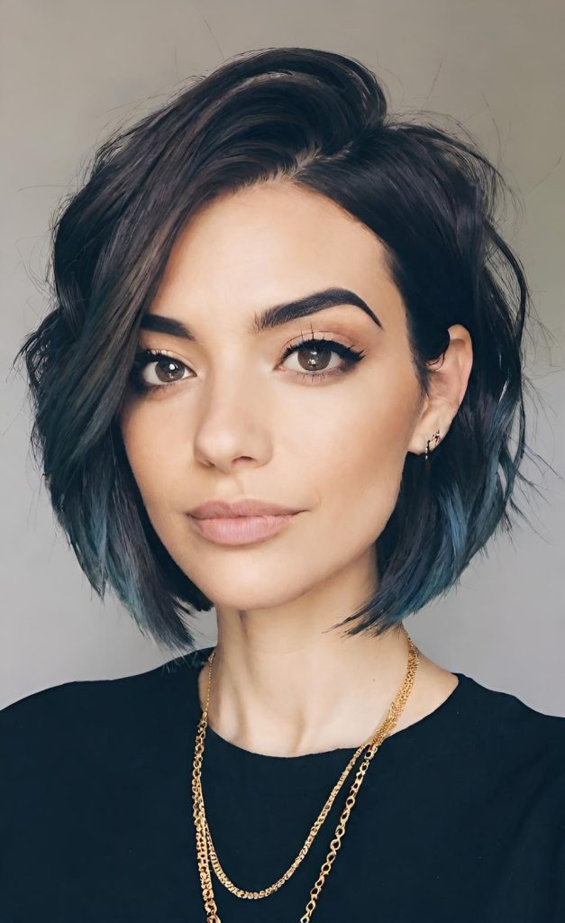 This look is a perfect blend of edgy and elegant. The messy, textured layers give a carefree vibe, while the dark, sophisticated base color is elevated by a subtle pop of teal at the ends. 🎨 This is a versatile and stylish cut that works for both a day at the office and a night out. It’s an effortless hairstyle that exudes confidence and shows you’re not afraid to play with color. A true statement piece for anyone looking to refresh their look. 💖