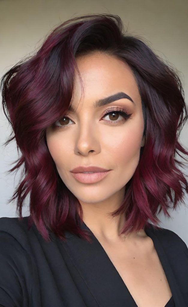 This haircut creates incredible dynamism with its heavily layered and tousled structure. The hair’s movement reveals the deep richness of the burgundy and wine-red tones. The side-swept bangs offer a soft frame for the face, perfectly complementing the overall edgy and cool vibe of the hair. This style is an excellent choice for women looking for a modern yet relaxed look. It’s an essential option for those who want to make a confident and bold statement. π