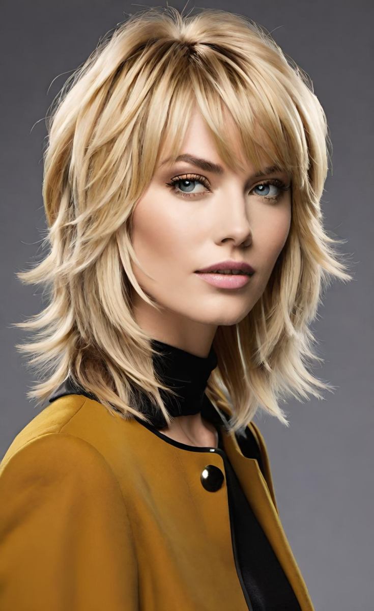 A V-shaped shaggy cut is flattering for blondes who want to add shape and texture to their hair. The layers are cut in a V shape, creating a sharp and defined look. This works well for both straight and slightly wavy blonde hair.