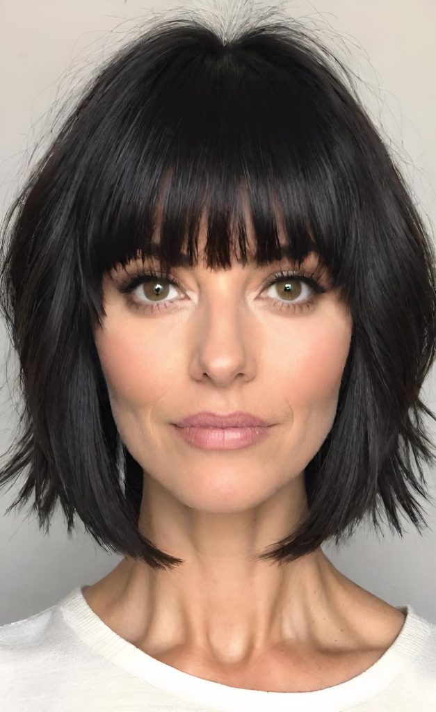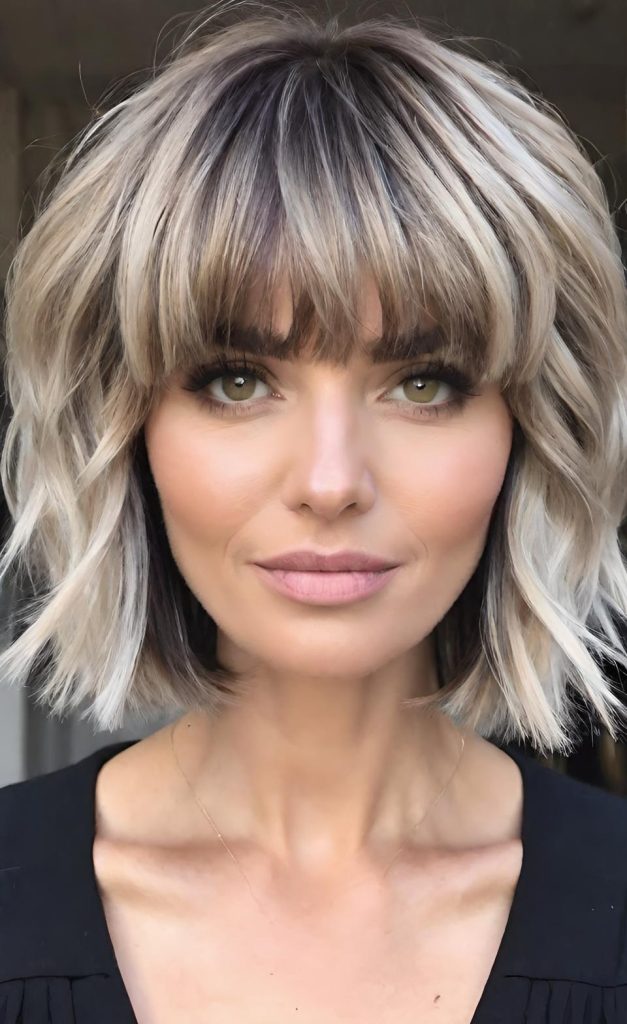 Wispy bangs add softness to the overall look. Instead of sharp lines, they gently frame the face and blend seamlessly into the layers. This detail keeps the haircut modern and flattering from every angle.