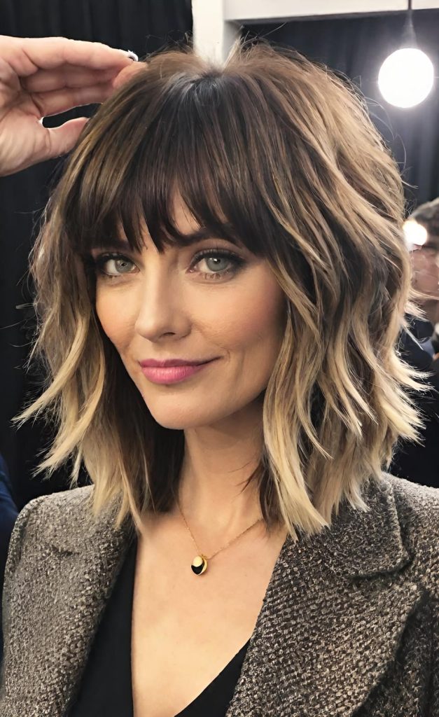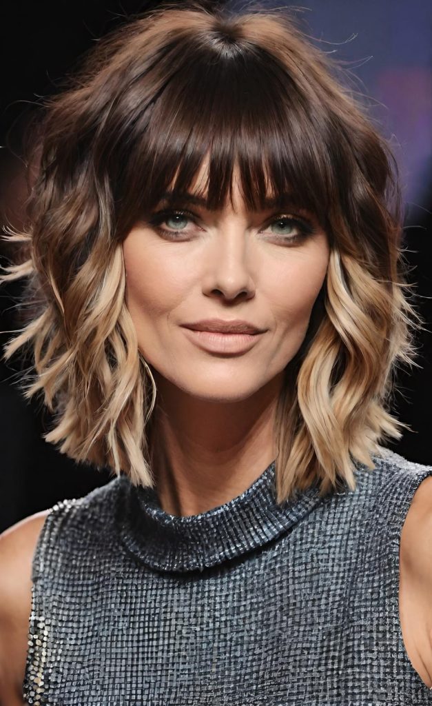 This captivating hairstyle is an excellent choice for women who are daring and trend-conscious. The shoulder-length wavy bob cut adds volume and dynamic movement to the hair, while the gently framing fringe instantly brings a touch of mystery and allure to the face. The dramatic balayage, transitioning from rich dark brown roots to striking blonde ends, provides a stunning contrast and depth, creating an incredibly modern and eye-catching effect. Despite being easy to maintain, this style ensures all eyes are on you in any setting, making it a favorite for confident and assertive women. A definite must-try! 💇♀️✨