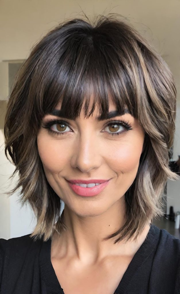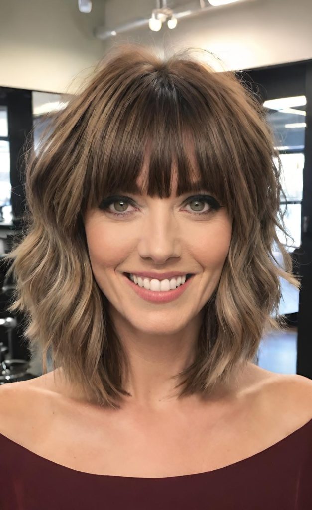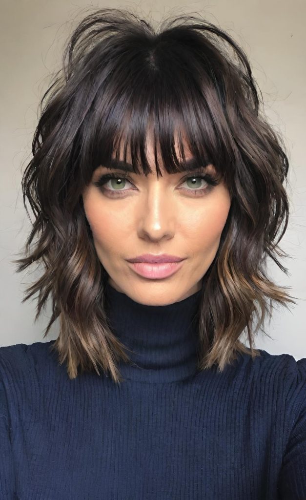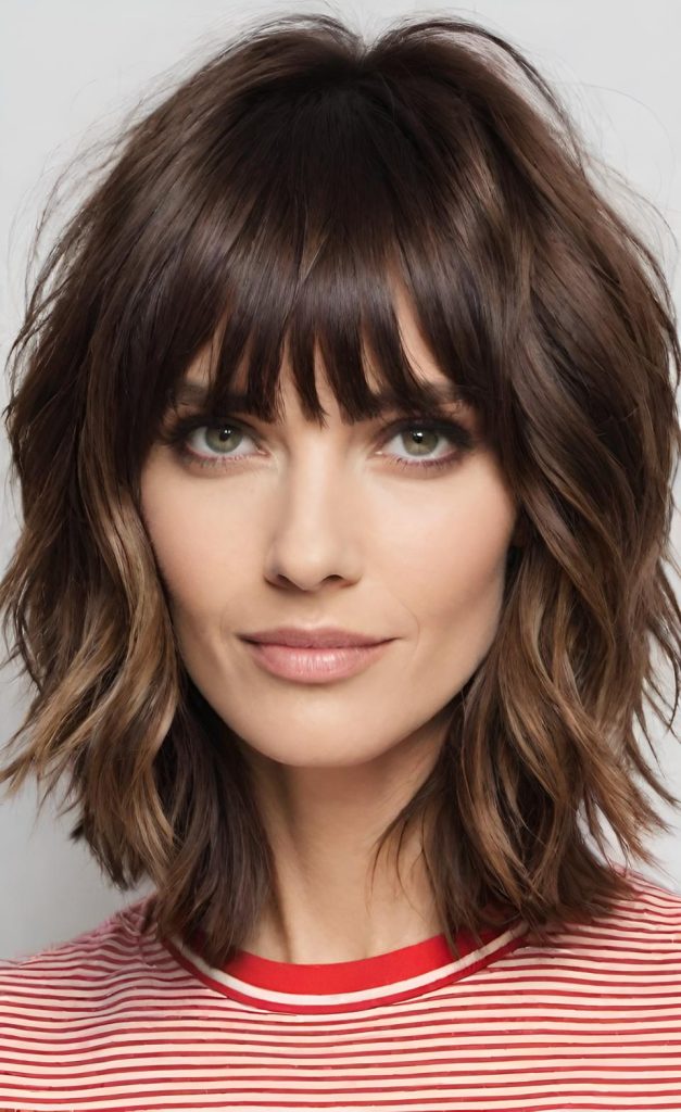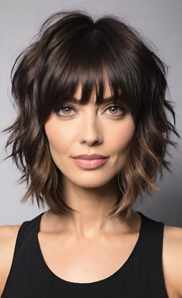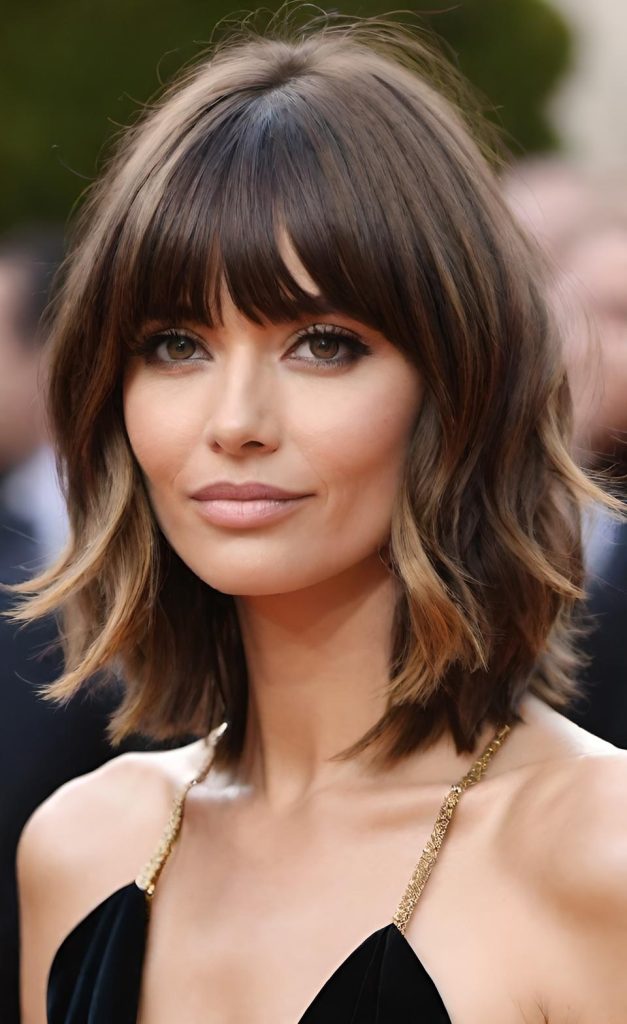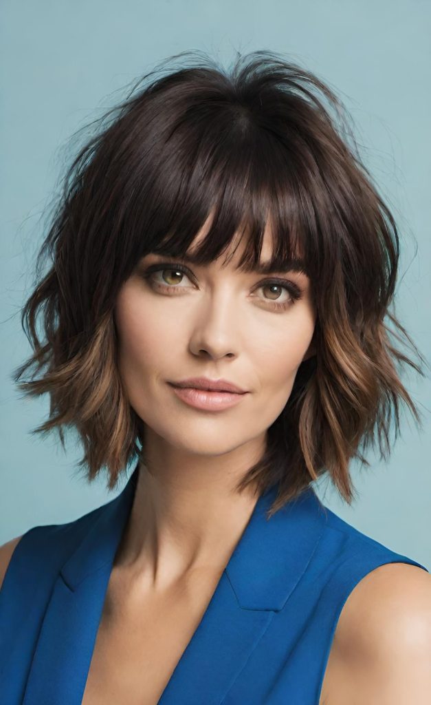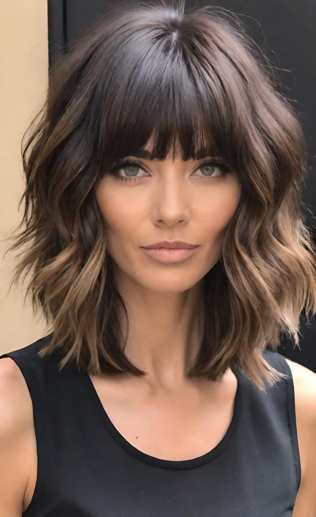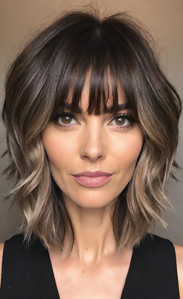 This captivating hairstyle is an excellent choice for women who radiate energy and joy. The shoulder-length, wavy, and layered bob cut adds natural volume and dynamic movement to the hair, while the gently framing fringe highlights your eyes, offering a warm and genuine expression that perfectly complements your smile. Balayage highlights, transitioning from warm brown tones to lighter shades at the ends, introduce depth and shimmer, creating a sun-kissed effect. Comfortable for daily wear yet striking and stylish in any setting, this cut imparts an energetic and youthful vibe. It’s definitely a must-try! 💇♀️✨