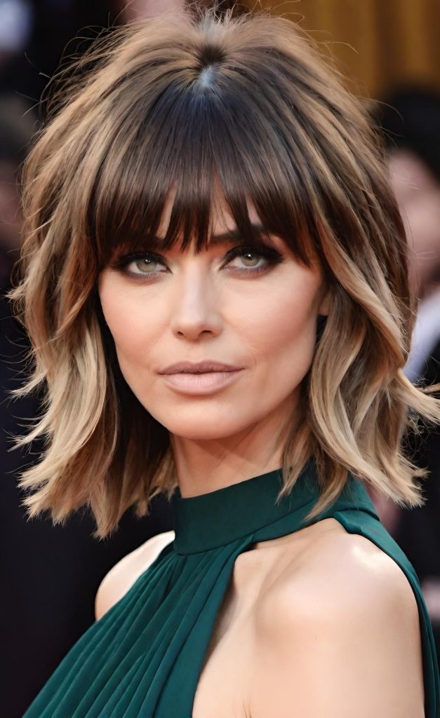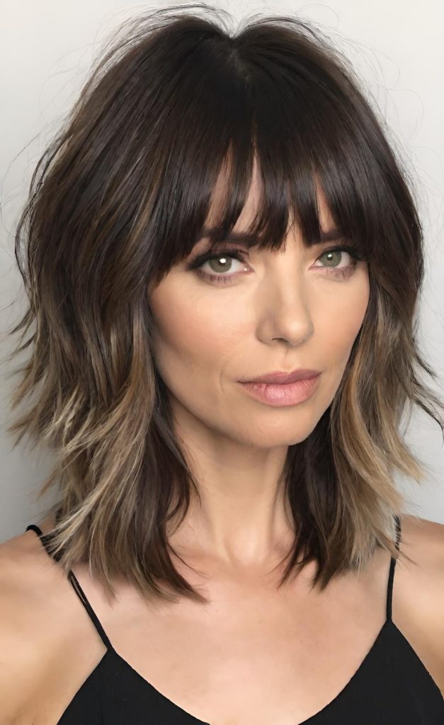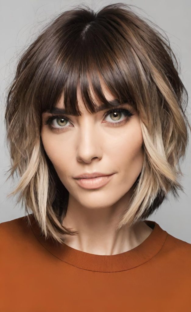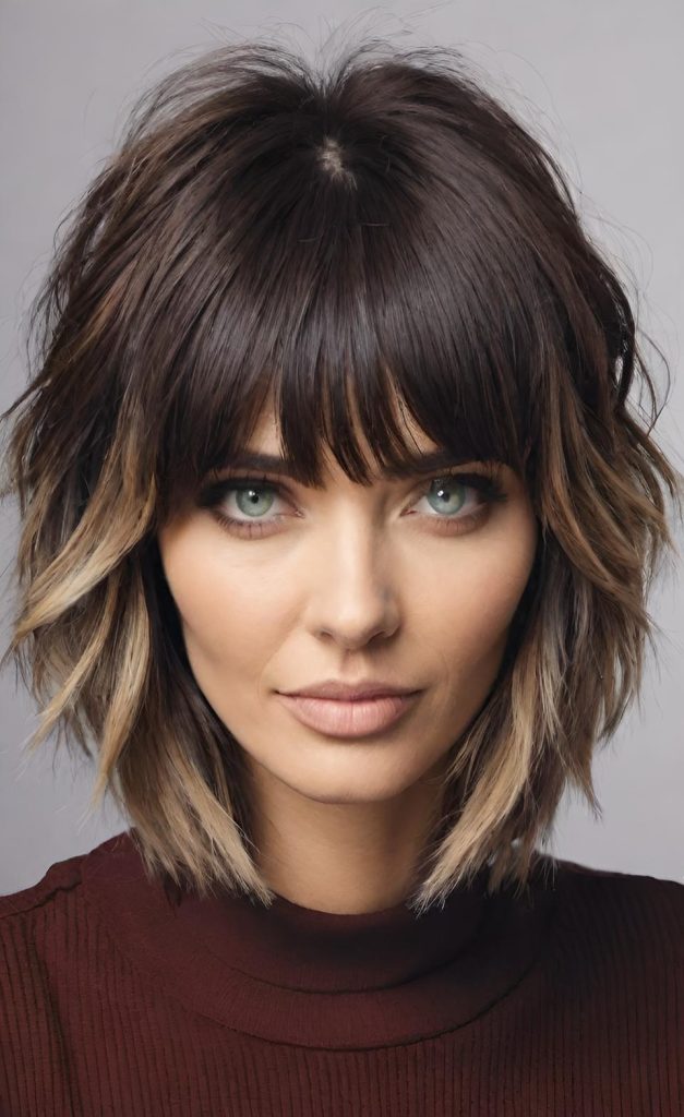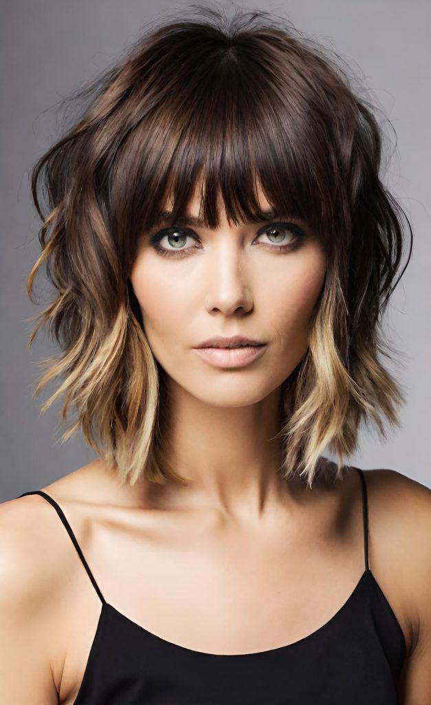 This captivating hairstyle is the perfect match for those who desire a modern and eye-catching look. This shoulder-length, layered bob injects volume and an edgy texture into the hair, while the full, prominent bangs beautifully highlight the eyes, giving the face a striking expression. The daring transition from rich dark brown to distinct blonde balayage at the ends adds an energetic contrast and remarkable depth to the style. Offering a unique flair for daily wear and a show-stopping effect for special occasions, this cut is sure to become a favorite for confident and assertive women. A must-try! 💇♀️✨
