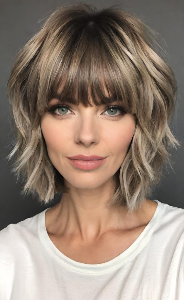 Effortless Chic: The Wavy Layered Bob with Bangs 🌟
