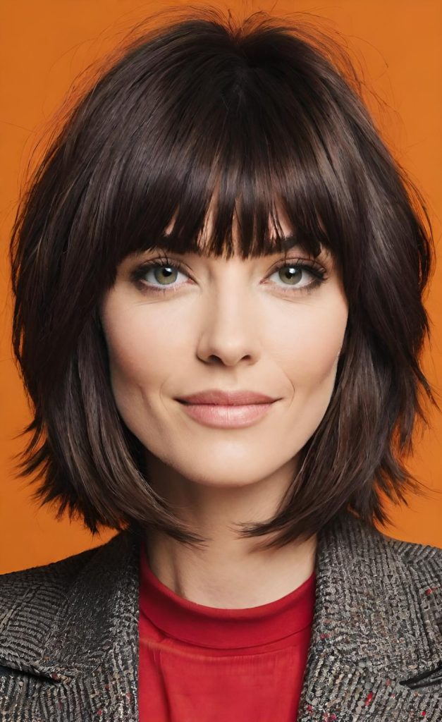 This stunning hairstyle is a perfect match for those who desire a sophisticated and timeless look. The deep, rich brown bob provides a sleek and polished frame for the face, while the full, iconic bangs beautifully highlight the eyes, instantly adding an alluring appeal. Subtle layering at the ends of the hair introduces natural movement and volume, preventing the style from looking flat and instead giving it a dynamic edge. Blending classic charm with a modern sensibility, this versatile cut is easy to maintain and effortlessly chic for any age or occasion. It’s the ultimate choice for understated glamour! 💇♀️