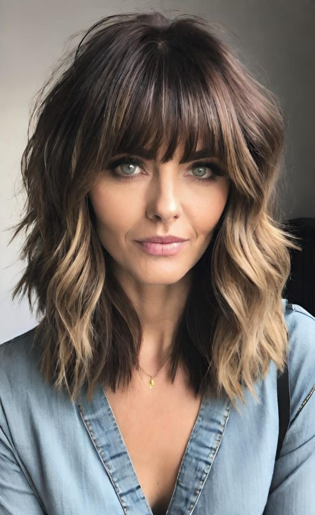This captivating hairstyle is an excellent choice for women who are daring and trend-conscious. The shoulder-length, wavy, and layered bob cut infuses the hair with volume and dynamic movement, while the full, prominent bangs immediately add an alluring charm by highlighting the eyes. The dramatic balayage, transitioning from rich dark brown tones to striking blonde ends, provides a stunning contrast and depth, creating an incredibly modern and eye-catching effect. Despite being easy to maintain, this style ensures all eyes are on you in any setting, making it a favorite for confident and assertive women. A definite must-try! 💇♀️✨